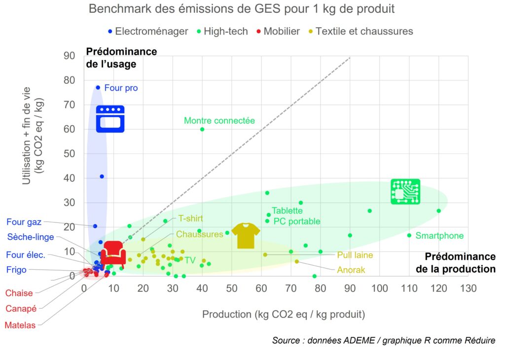 De plus, ce graphique décompose les impacts entre l’étape de production et l’étape d’utilisation (+ fin de vie). Il permet donc également d’identifier les priorités d’optimisation dans une optique d’éco-conception.